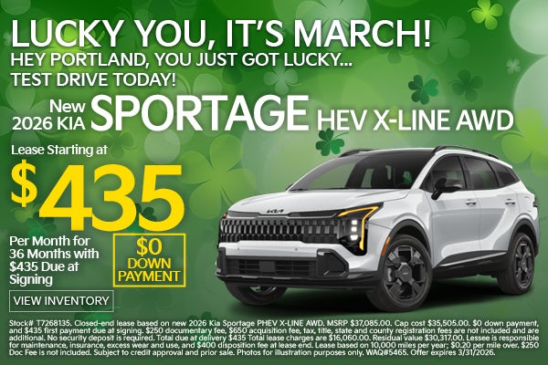 Stock# T7268135. Closed-end lease based on new 2026 Kia Sportage PHEV X-LINE AWD. MSRP $37,085.00. Cap cost $35,505.00. $0 down payment, and $435 first payment due at signing. $250 documentary fee, $650 acquisition fee, tax, title, state and county registration fees are not included and are additional. No security deposit is required. Total due at delivery $435 Total lease charges are $16,060.00. Residual value $30,317.00. Lessee is responsible for maintenance, insurance, excess wear and use, and $400 disposition fee at lease end. Lease based on 10,000 miles per year; $0.20 per mile over. $250 Doc Fee is not included. Subject to credit approval and prior sale. Photos for illustration purposes only. WAQ#5465. Offer expires 3/31/2026.